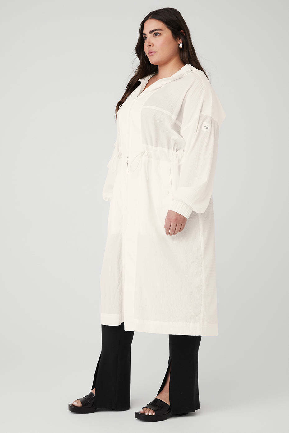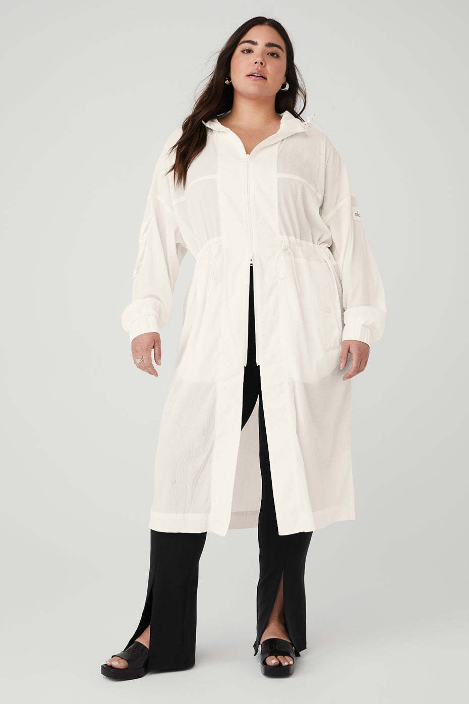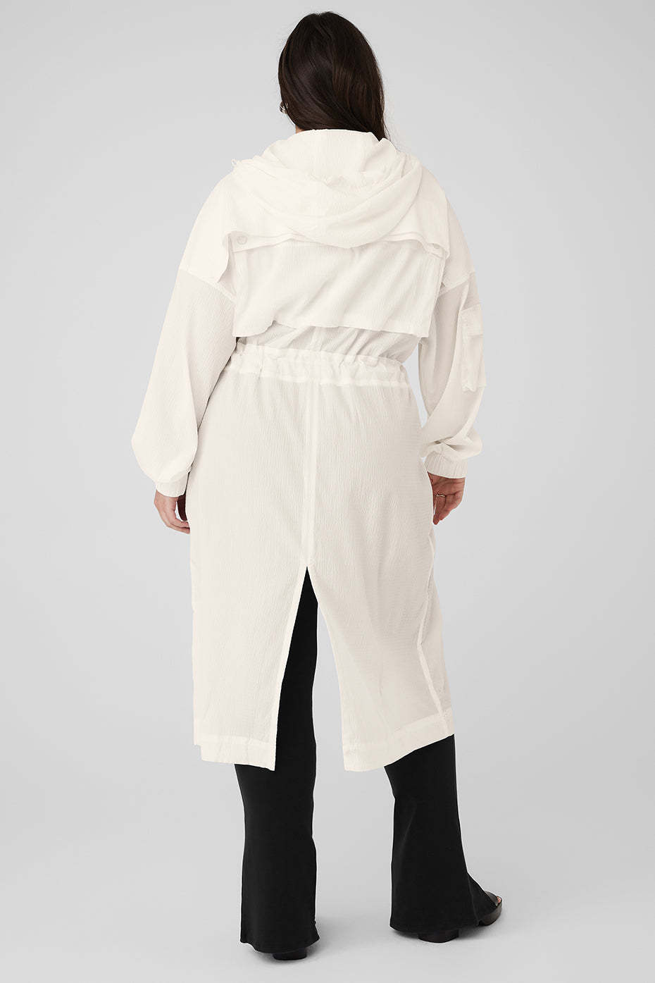 For effortless ease at the airport or on-the-go, throw on this long, lightweight coat. It's made from a slightly sheer fabric with a relaxed fit and a little texture, plus a long hem and a back slit for drape and movement. Functional features like an adjustable hood, a back flap, cuffs and a front zipper score points for practicality. Zip it over a workout set, leave it open over a onesie—you do you.