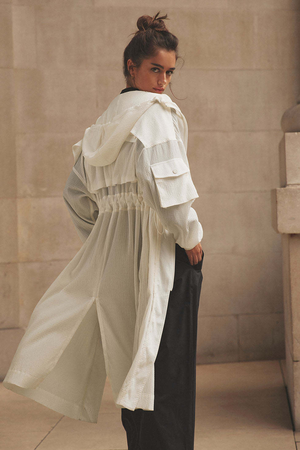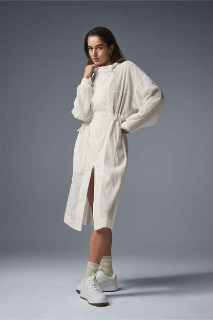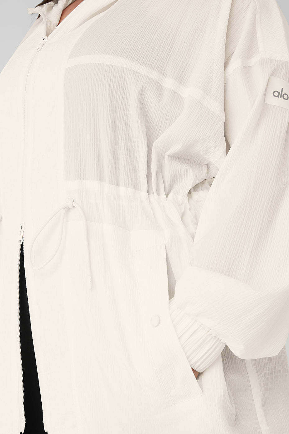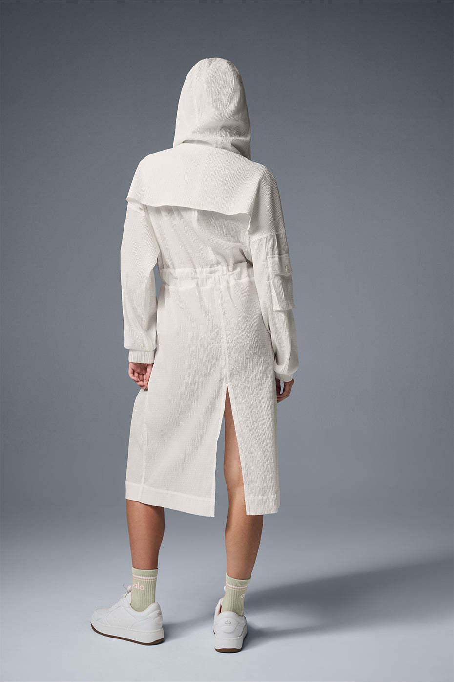 For effortless ease at the airport or on-the-go, throw on this long, lightweight coat. It's made from a slightly sheer fabric with a relaxed fit and a little texture, plus a long hem and a back slit for drape and movement. Functional features like an adjustable hood, a back flap, cuffs and a front zipper score points for practicality. Zip it over a workout set, leave it open over a onesie—you do you.