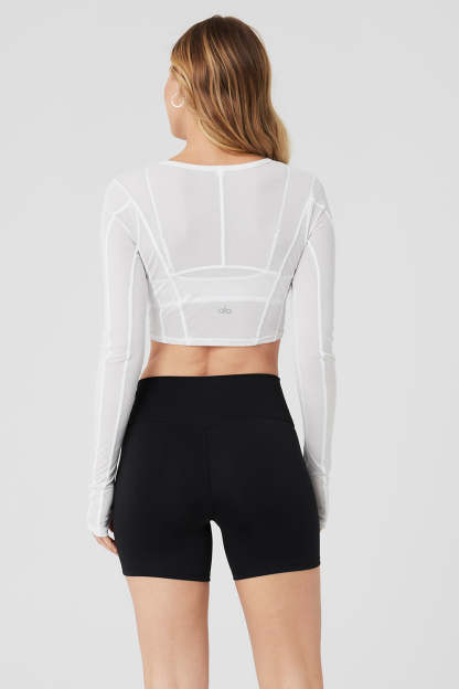 Stop staring, start wearing. The Mesh Cropped Fine Line Long Sleeve combines ultra-fine, soft performance mesh with structured paneling and a curved front hem for a corset-inspired cropped, high-neck long sleeve. Complete the look with a tennis skirt or capri leggings.
